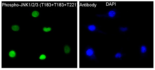 The Phospho-JNK1/2/3 (Thr183+Thr183+Thr221) antibody detects JNK isoforms (JNK1. JNK2. JNK3) when phosphorylated at specific activation loop residues: Thr183 in JNK1/JNK2 and Thr221 in JNK3. These phosphorylation events, along with Tyr185 (JNK1/JNK2) or Tyr223 (JNK3), are critical for JNK activation, a process mediated by upstream kinases MKK4 and MKK7 in response to stress signals (e.g., UV radiation, cytokines, oxidative stress). Activated JNKs translocate to the nucleus, phosphorylate transcription factors like c-Jun and ATF2. and regulate apoptosis, inflammation, proliferation, and differentiation.
