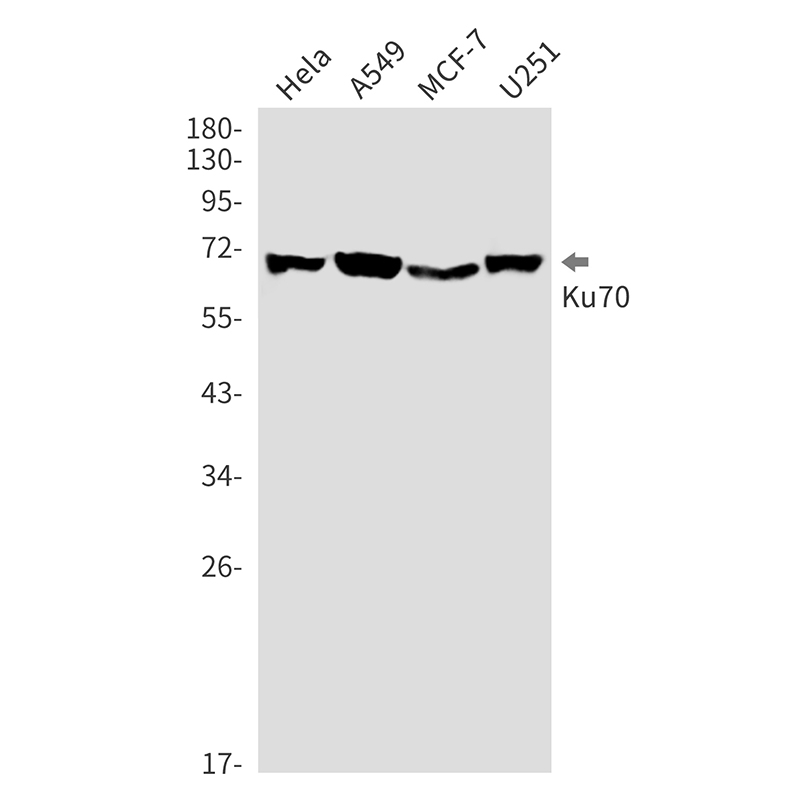 Antibodies against Ku70 are widely used to study its expression, localization, and function via techniques such as Western blotting, immunofluorescence, and immunoprecipitation. They aid in investigating DNA damage responses, cancer biology (e.g., radiation resistance), and autoimmune disorders, as autoantibodies targeting Ku proteins are linked to conditions like systemic lupus erythematosus (SLE). Researchers also employ Ku70 antibodies to explore aging-related genomic instability and neurodegenerative diseases. Available as monoclonal or polyclonal variants, these antibodies are critical for validating Ku70 knockdown/knockout models and elucidating its non-canonical roles, including viral infection responses and mitochondrial dynamics. Proper validation ensures specificity, minimizing cross-reactivity with homologous proteins like Ku80.