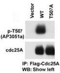 **摘要**:研究使用Phospho-CDC25A(T507)特异性抗体,证实DNA损伤信号中ATM/ATR激酶通过磷酸化CDC25A的T507位点,促使其与14-3-3蛋白结合并滞留于胞质,从而抑制CDK2活性并阻滞细胞周期。