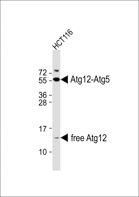 The ATG12 (N-term) antibody is a widely used tool in autophagy research, targeting the N-terminal region of the autophagy-related 12 (ATG12) protein. ATG12 is a critical component of the ubiquitin-like conjugation system essential for autophagosome formation, a key step in macroautophagy. During this process, ATG12 covalently binds to ATG5 via a ubiquitin-like conjugation mechanism, forming the ATG12-ATG5 complex. This complex further interacts with ATG16L1 to create a multimeric complex that promotes LC3 lipidation and autophagosome membrane expansion.