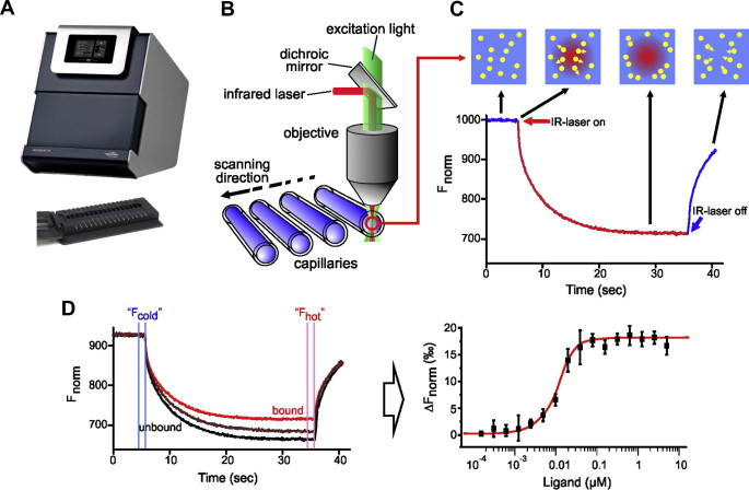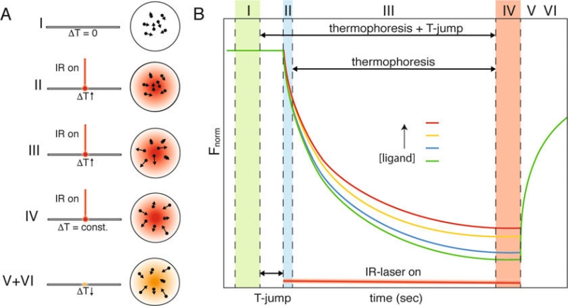 MST 技术通过红外激光在样品溶液中建立局部温度场实现分子相互作用分析。实验时,将一个分子(如蛋白)用荧光染料标记或融合 GFP 标签,与待测分子按浓度梯度置于毛细管中。当激光聚焦加热时,会在照射区域形成温度梯度分布,分子由高温区域向低温区域定向迁移,其迁移的程度与质量、带电性及分子间相互作用密切相关,通过检测荧光标记的分子或天然荧光分子的荧光信号,可以获得分子间结合的亲和力常数 Kd。